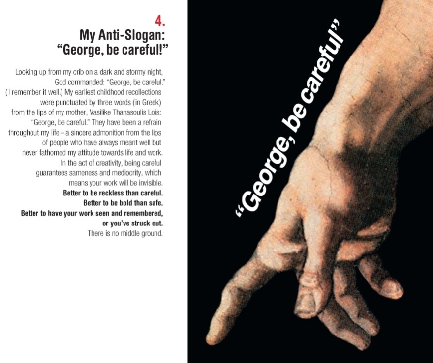 Even though the synergy between words and images is crucial, Lois always tells people just starting out in advertising that when concocting a great ad, the words must come first. "They look at me stunned," he says. "They say, 'No, no, you create these powerful visual images. Why would you think of copy first?' I say, 'Because, a line, a slogan should be famous."
