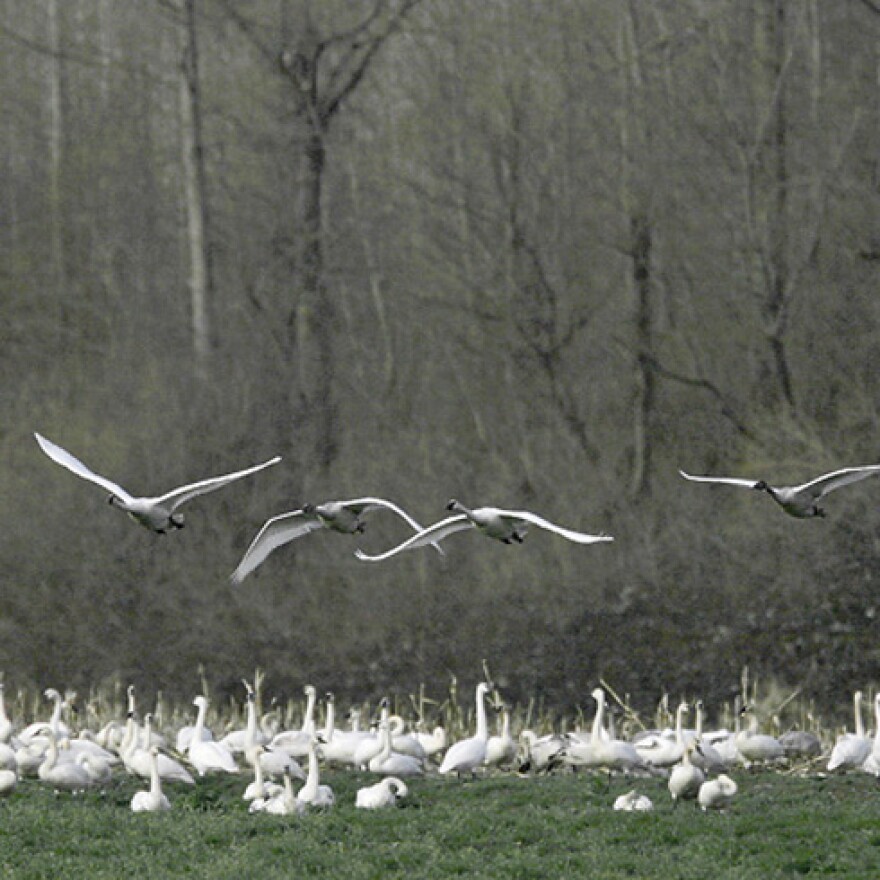 Trumpeter Swans land in a plowed field to forage for remnant potatoes, grain, and other waste crops. This swan is among the largest of all waterfowl; the Tundra Swan is somewhat smaller. These swans migrate in family groups each fall from nesting sites in Canada and Alaska. Learn more about these swans, and view a map to the Skagit Flats of Washington where you can see them. When you go, please be courteous, and if you stop, pull completely off the roadway. Always respect private property. More info at The Trumpeter Swan Society!