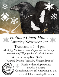 Childhood’s End Gallery presents our annual Holiday Open House. Featuring a trunk show with Olympia jewelry artist Jeff McKenzie from 1 - 4pm, our newest exhibit “Animal Dreams” artist reception from 3 - 5pm, raffles all day, snacks and drinks, and complimentary gift wrapping. Saturday, Nov 22nd