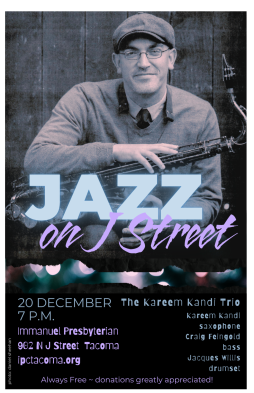 World class Jazz saxophone player and Golden Ear award winner Kareem Kandi brings his trio to Jazz on J Street. Based in Tacoma, Kareem Kandi travels to France annually to participate in the thriving Jazz scene there.
