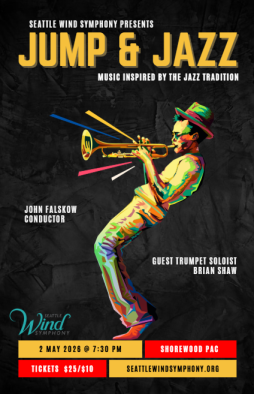 Experience the fusion of swing and concert band power as the Seattle Wind Symphony presents “Jump & Jazz!” on Saturday, May 2, 2026, at 7:30 PM. Join us at the Shorewood Performing Arts Center for an evening that bridges the concert hall and the jazz club. We are thrilled to have the virtuosic and versatile trumpeter Brian Shaw as the featured soloist. This program showcases a variety of composers influenced by the jazz language: the rhythmic energy of Adam Gorb’s Awayday, the Clarino trumpet concerto by Greg Yasinitsky, the tender sounds of Summerland by William Grant Still, and more.