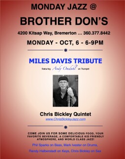 Monday Night Jazz at Brother Don's Oct. 6th: Tribute to Miles Davis featuring trumpet master Andy Omdahl.