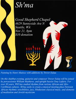 On this shabbat evening, guitarist and composer Trevor Eulau will be joined by percussionist William Matthews, and upright bassist Tony Lefaive. For over 30 years, Will has studied rhythms from various African and Afro-Caribbean cultures. Sh'ma seeks to create a musical meeting place between African rhythmic sensibilities, jazz, Hindustani classical music, and elements of meditation and Jewish mysticism.