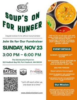 Let's help our food banks brace for a surge in need! Join us for an all-you-can-eat soup, salad, and rolls dinner in the Bayview Room at The Old Alcohol Plant Inn. Profits from the event will be donated to the Jefferson County Food Banks; guests are also welcome to donate cash or non-perishable foodstuffs at the door.