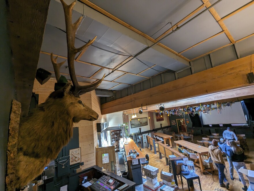 A huge elk head named Arthur hangs above the entrance to the back room, which houses the music venue.