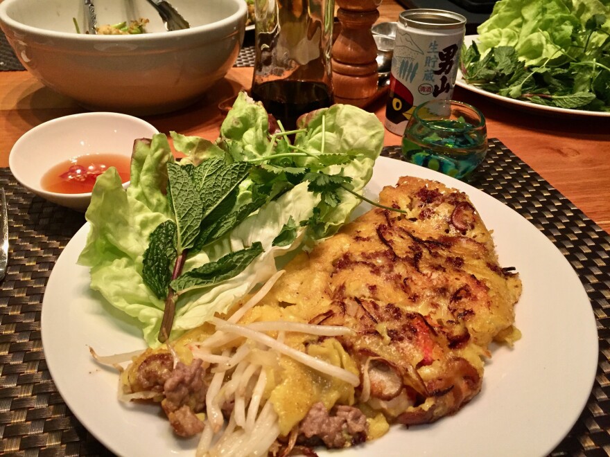 "The first one I made was the sizzling rice crepes," Nancy said. The crepes are made of rice flour, colored and flavored with turmeric and coconut milk and filled with ground pork, shrimp, beans spouts and green onions. "I've had this at local Vietnamese restaurants and it was really great to make it at home with things you can buy at your local supermarket."